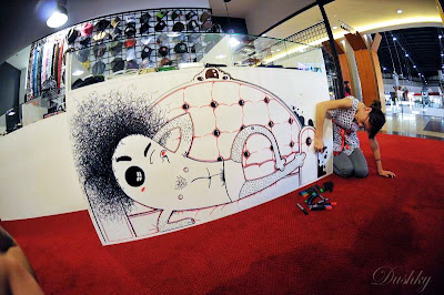 I was, and still am, collaborating with a local skate shop, called Uman, they also organised the competitions in which I painted on monster shoes. As a result... many projects. One of them was the custom counter I painted for their shop in Cluj. It took around 15 hours in total and I used street art for reference and my humble imagination. I also incorporated some of the shoes & clothing labels the shop is working with. I used simple coloured permanent markers, you can find those anywhere. If you want to fill in the shapes, then I suggest acrylics or tempera colours because markers leave this shade when you go over one layer and it doesn't look quite professional.